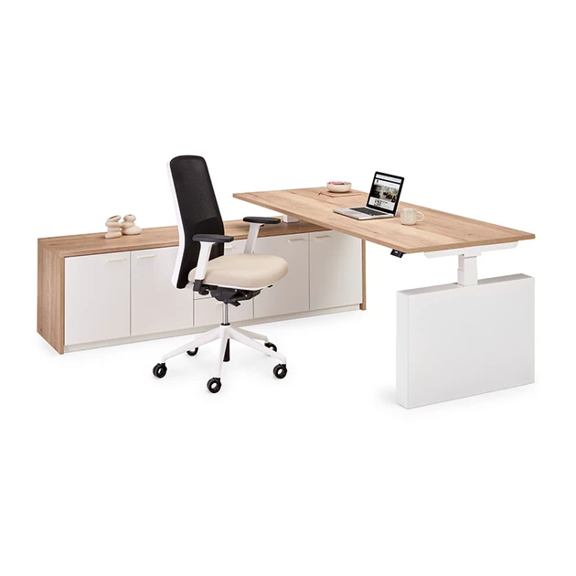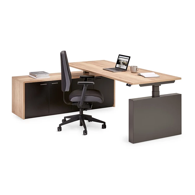 Een ergonomisch directiebureau met aanbouw, dat is het Directie zit-sta bureau Flex 3+ manager. Stel zelf uw ideale hoek samen met de vele maten bureaubladen, T-poot onderstel en configureer uw aanbouwkast in de gewenste uitvoering. De speciaal vervaardigde kasten zijn compleet uitgerust met softclose deuren en voorzien van handige legplanken. De achterzijde van de kast is keurig vlak en solide afgewerkt voor plaatsing in elke ruimte. De elektrisch verstelbare werkplek is standaard voorzien van een memory-unit met hoogte aanduiding.