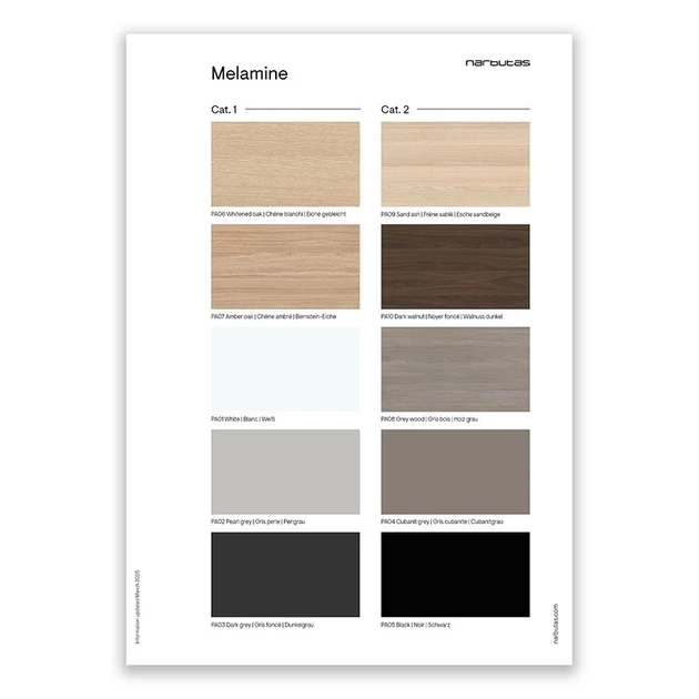 Bent u op zoek naar de perfecte kleur voor uw kantoorinrichting? Maak het kiezen eenvoudig met onze melamine kleurstaalkaart. Deze handige kleurenkaart bevat alle beschikbare melamine kleuren, ideaal voor het selecteren van de juiste afwerking voor bureaubladen, kasten, tafels en ander kantoormeubilair van Narbutas. De kleurstaalkaart is ontworpen om u te helpen een weloverwogen keuze te maken die perfect past bij uw wensen en interieur.