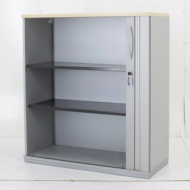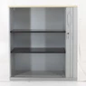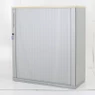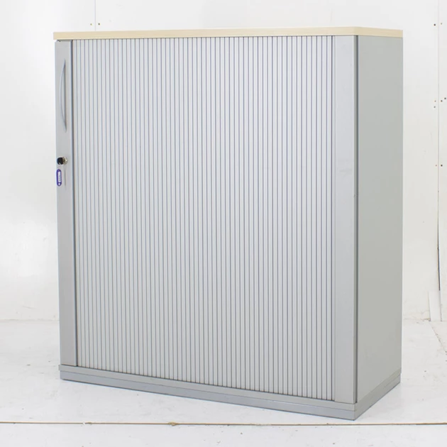 De gebruikte middelhoge roldeurkast is 100cm breed en volledig van melamine. De roldeur is afsluitbaar door het cilinderslot met sleutel zodat u veilig spullen kunt opbergen in deze kast.