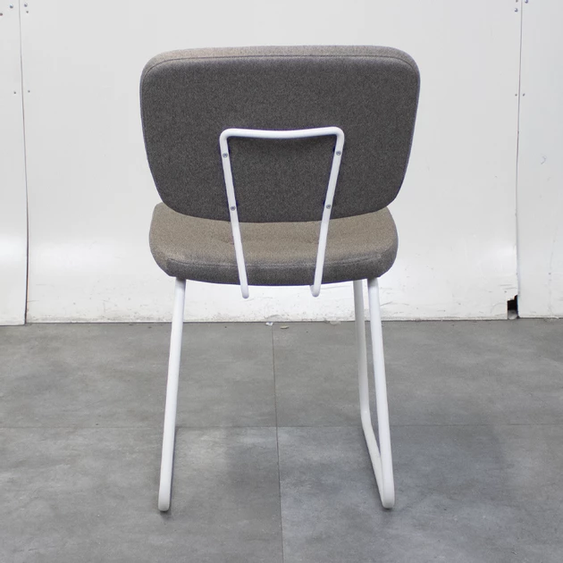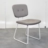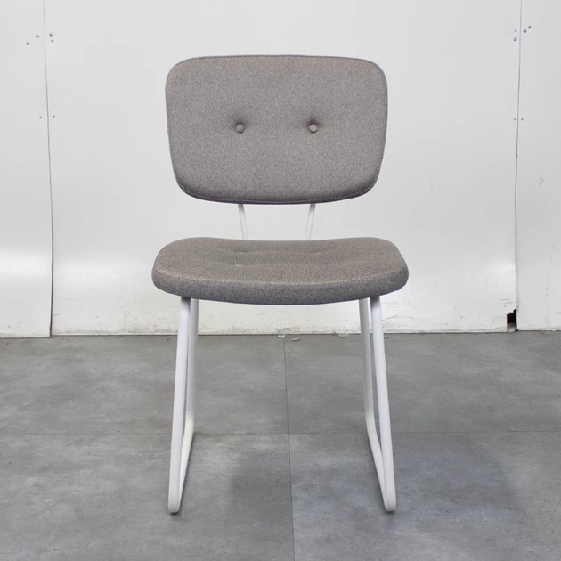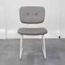 Deze trendy retro design stoel valt op door zijn stijlvolle afwerking en comfortabele zit. De gestoffeerde rug en zitting in grijze uitvoering zijn voorzien van decoratieve knoppen, wat de stoel een karaktervolle en warme uitstraling geeft. Het witte metalen 4-poots frame zorgt voor een modern contrast en een stabiele basis.